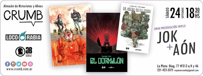También este sábado 24 de Septiembre, pero a las 19:30 hs., se presentan en La Plata las recientes publicaciones del sello Loco Rabia: El Color de la Nieve (de Alejandro Farías y Tomás Gimbernat), Reflejo (de Rodolfo Santullo y Jok) y El Dormilón (de Santullo y Carlos Aón).
