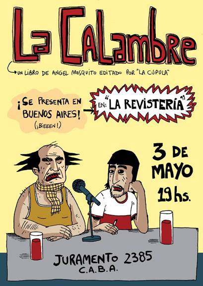 Para todos aquellos habitantes de la gran ciudad capital (del país esta vez) que se quedaron con ganas de comprar el libro y llevárselo firmado a la casa para mostrárselo a su mamá o a su abuelita, Angel Mosquito realiza una nueva presentación de su novela gráfica La Calambre (editada en España por la Cúpula).