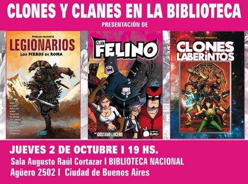 Este jueves 2 de Octubre a las 19 hs., la Sala Augusto Raúl Cortazar de la Biblioteca Nacional (Agüero 2502, ciudad de Buenos Aires) será la sede para la presentación de tres libros de historieta: Clones y Laberintos, de Carlos Scherpa y varios dibujantes, Clan Felino, de Gustavo Lucero, y Legionarios: Los Perros de Roma, de Carlos Scherpa y varios dibujantes rosarinos. Se trata de tres títulos recientemente editados por los sellos Conejo Blanco y La Duendes.