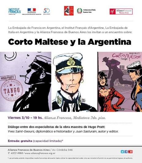 La embajada de Francia en Argentina, el Institut Français d´Argentine, la embajad de Italia en Argentina y la Alianza Francesa de Buenos Aires nos invitan a todos a una charla acerca de Corto Maltese y la Argentina.