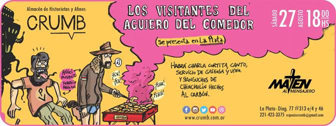 Todo ese material estará esa tarde en Crumb (diagonal 77 n. 313, entre 4 y 46, ciudad de La Plata) y además los autores brindarán una charla corta, acompañada de canto, servicio de vino y gaseosa, y sanguches de chinchulines al carbón!