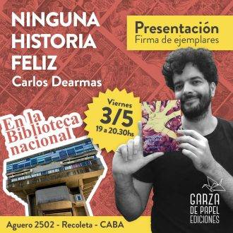 Este viernes 3 de mayo de 19 a 20.30 hs se va a presentando «Ninguna historia feliz», el flamante libro de Carlos Dearmas, publicado por Garza de Papel.