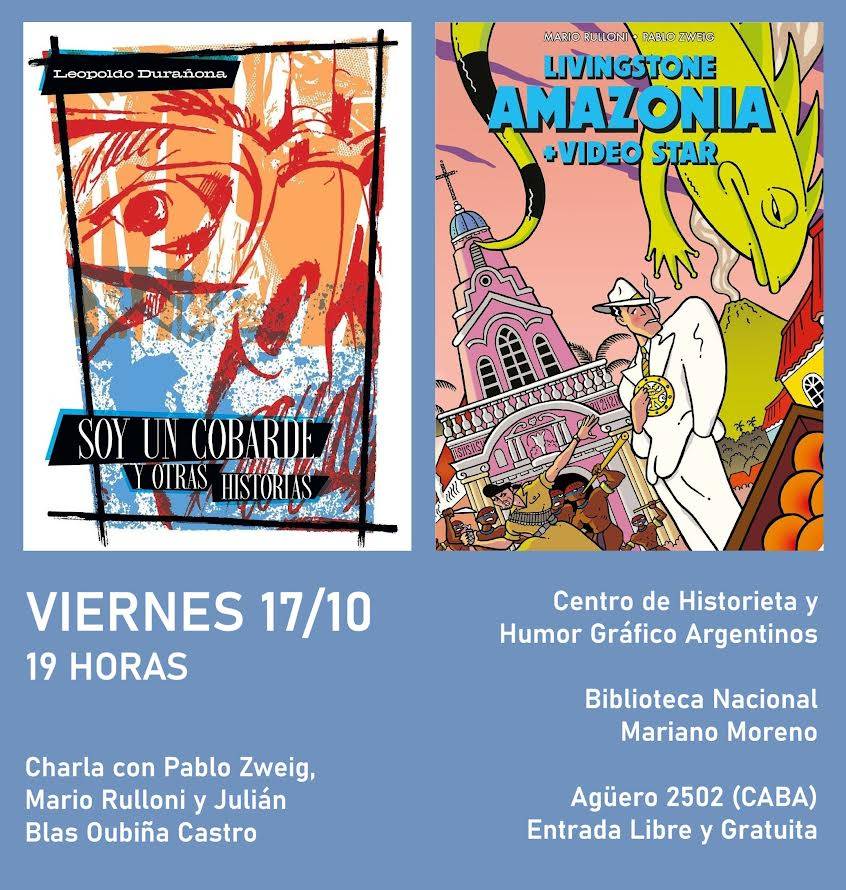 Este viernes 17 a las 19 hs se presentan de manera conjunta los dos últimos lanzamientos del sello Sector Editorial: Soy un Cobarde y otras historias de Leopoldo Durañona y guionistas varios, y Livingstone: Amazonia + Video Star de Mario Rulloni y Pablo Zweig, con la presencia de estos dos autores en una charla que contará con la conducción de Julián Blas Oubiña Castro.