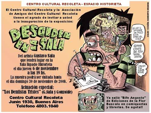 Así es amigos, porque el jueves 6 de noviembre a las 19 hs. inaugura la muestra «Desorden en la Sala», con trabajos del delirante creador de «Bife Angosto» -cuya recopilación en libro ya pueden conseguir en librerías y comiquerías, editada por De la Flor-. La cita es en el clásico Espacio Historieta del Centro Cultural Recoleta (Junín 1930, Ciudad de Buenos Aires), y contará con la presencia del dúo «Los Dentistas Tristes» (Gustavo Sala y Gonzoide) animando la tarde con sus canciones. La expo se puede visitar hasta el 30 de noviembre.