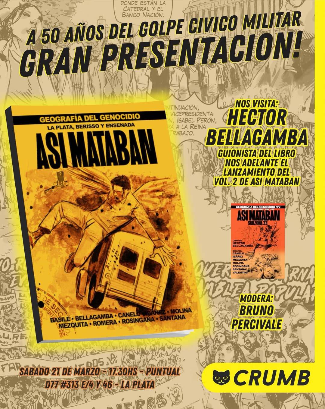 A 50 años del golpe cívico militar, Héctor Bellagamba se presenta en Crumb para hablar de "ASÍ MATABAN, geografía de un genocidio", en una charla moderada por Bruno Percivale.