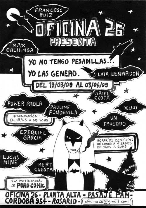«Yo no tengo pesadillas… yo las genero» es el nombre de una exposición colectiva que reúne a historietistas y artistas plásticos que trabajan con recursos del comic. Participan Francesc Ruiz y Mery Cuesta (España), Pauline Fondevila (Francia), Powerpaola (Colombia), Ezequiel García, Delius, Lucas Nine y la Revista de Aventuras Un Faulduo (Buenos Aires), y los rosarinos Max Cachimba, Ariel Costa y Silvia Lenardón.