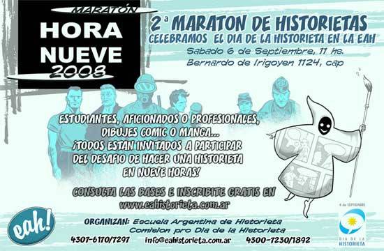 Por segundo año consecutivo, la EAH (Escuela Argentina de Historieta) organiza la maratón Hora Nueve, para sumarse a los festejos por el Día de la Historieta. Como en la edición anterior, se convoca a guionistas, dibujantes y aficionados a que se acerquen el sábado 6 de septiembre a las 11 hs a la sede de Bernardo de Irigoyen 1124, Ciudad de Buenos Aires.