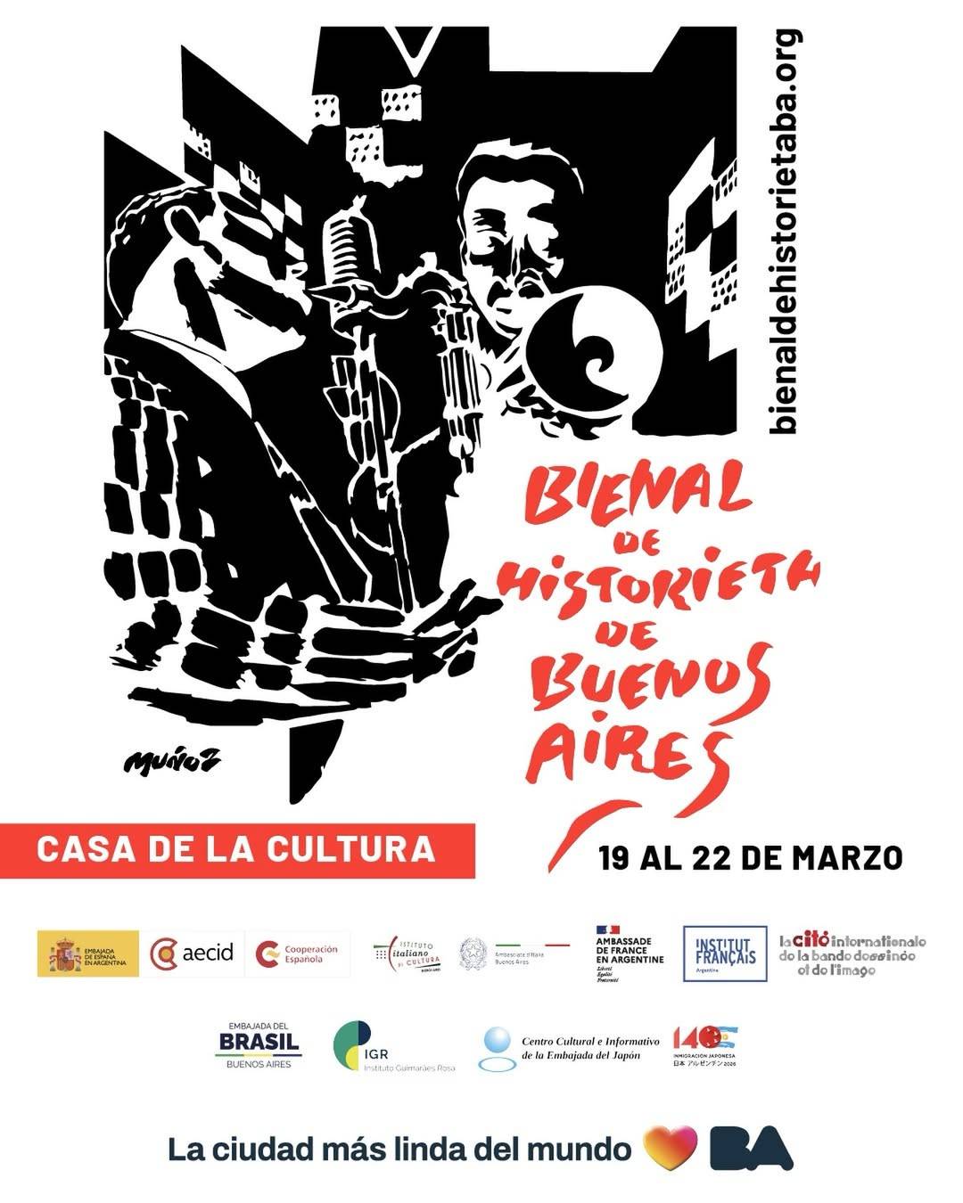 Del 19 al 22 de marzo de 2026 se realizará la Bienal de Historieta de Buenos Aires, que tiene como padrino a uno de los grandes maestros, el dibujante argentino José Muñoz. El evento, de entrada libre y sin costo, se desarrollará en la Casa de la Cultura, ex edificio del diario La Prensa (Av. de Mayo 575).