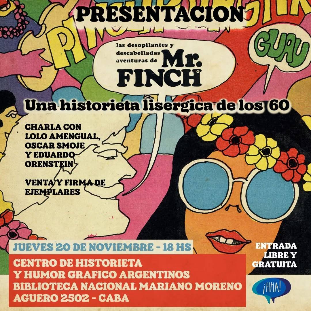 Este jueves 20 a las 18 hs, en el Centro de Historietas y Humor Gráfico de la Biblioteca Nacional (ubicado en Agüero 2502, ciudad de Buenos Aires) se realizará la presentación del libro que rescata "Las desopilantes y descabelladas aventuras de Mr. Finch", editado por Rayo Rojo.