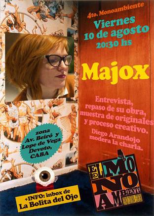 Este viernes 10 de Agosto a las 20:30 hs, el periodista y guionista Diego Arandojo va a conducir una entrevista pública con Majox, la talentosa ilustradora, historietista y humorista gráfica. La charla (cuarta dentro del ciclo El Monoambiente) va a abarcar un repaso por su obra, su proceso creativo y además Majox va a mostrar sus originales.