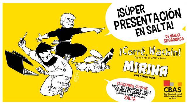 Nahuel presentará los libros ¡Corré, Wachín! (publicado por Noviembre) y Mirina: Café y Tortas Robot (publicado por Loco Rabia). También habrá dibujo en vivo, firmas, regalos y SORPRESAS.