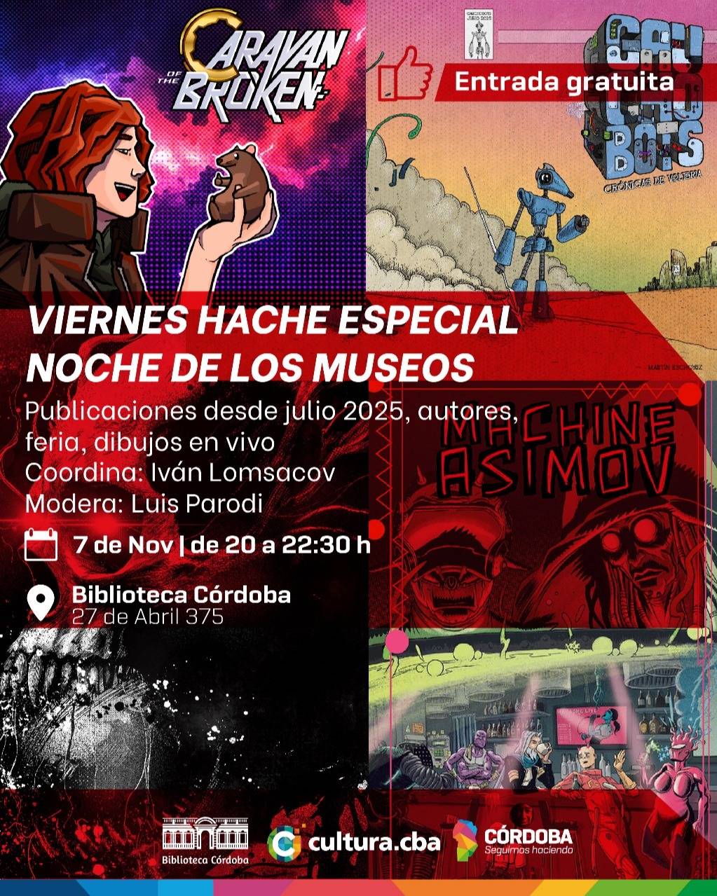 Se trata de una fecha especial del ciclo Viernes Hache, que esta vez coincide con la Noche de los Museos. El ciclo, coordinado por Iván Lomsacov, ofrece ambientación musical temática y estéticamente acorde, charla con lxs autorxs -moderada por Luis Parodi-, muchas imágenes pero pocos spoilers, acción colectiva de dibujo en vivo, venta y dedicatoria de ejemplares.
