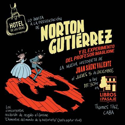 Este jueves 5 de Diciembre a partir de las 18:30 hs se presenta Norton Gutiérrez y el Experimento del Profesor Maglione, el segundo libro del aventurero uruguayo creado por Juan Sáenz Valiente y editado recientemente por Hotel de las ideas.