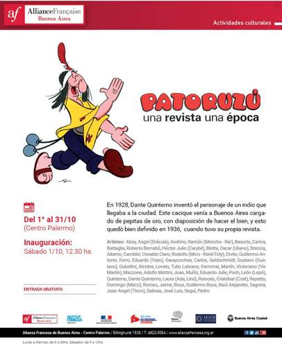 Este sábado, 1 de Octubre, a las 12:30 hs, se inaugura la muestra «Patoruzú: una revista, una época», en el Centro Palermo de la Alianza Francesa de Buenos Aires (Billinghurst 1926).