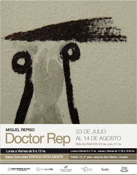 «Doctor Rep» es el nombre de la muestra de trabajos que el dibujante y humorista Miguel Rep expone en la ciudad de Mendoza. Inaugura el 23 de julio a las 21 hs. en las Salas Culturales Edificio Inteligente (Peltier 10, 2º piso, esquina San Martín, ciudad de Mendoza). Se puede visitar hasta el 14 de agosto de lunes a viernes de 9 a 14.30 hs. y los jueves y viernes de 17.30 a 19.30 hs.
