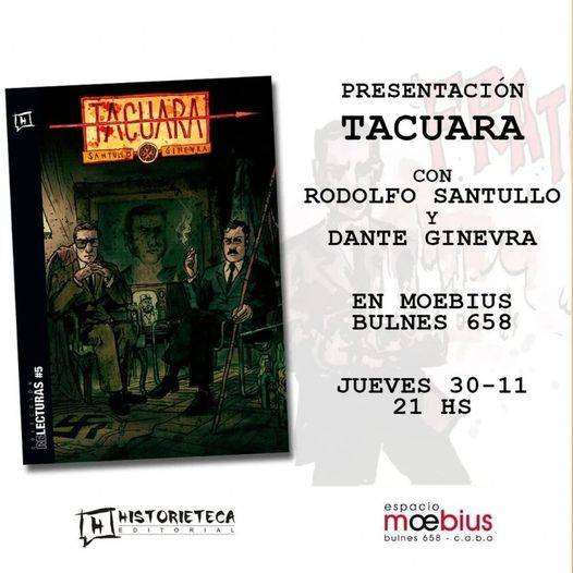 Este jueves 30 a las 21 hs, se realiza la presentación en Buenos Aires de Tacuara, el libro recientemente editado por Historieteca que recopila una historieta realizada por Rodolfo Santullo y Dante Ginevra para la revista Fierro, hace ya 10 años.