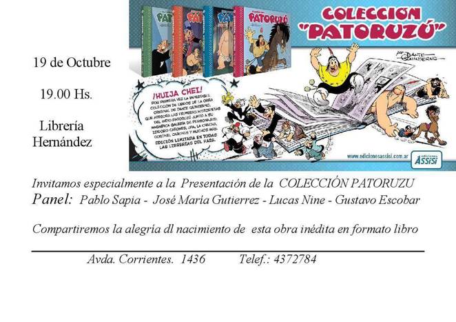 La Colección Patoruzú, editada por el sello Assisi y coordinada por Pablo Sapia, se presenta el jueves 19 de Octubre a las 19 hs., en la Librería Hernández (Av.Corrientes 1436, ciudad de Buenos Aires), con una charla en la que participarán Sapia, José María Gutiérrez, Lucas Nine y Gustavo Escobar.