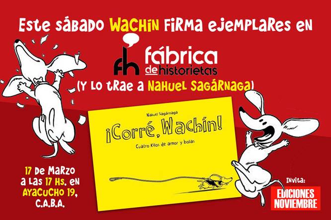 Este sábado 17, a partir de las 17 hs, acercate a la Fábrica de Historietas (Ayacucho 19, ciudad de Buenos Aires), donde podrás conocer al gran Nahuel Sagárnaga, quien va a estar firmando ejemplares de su libro ¡Corré, Wachín!, junto a su célebre mascota.