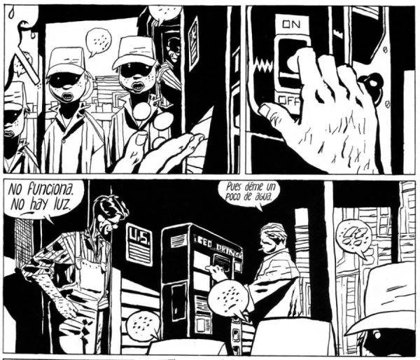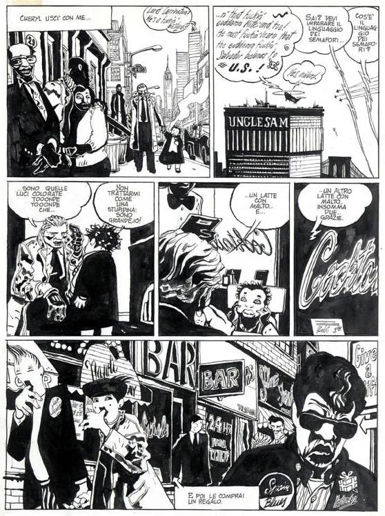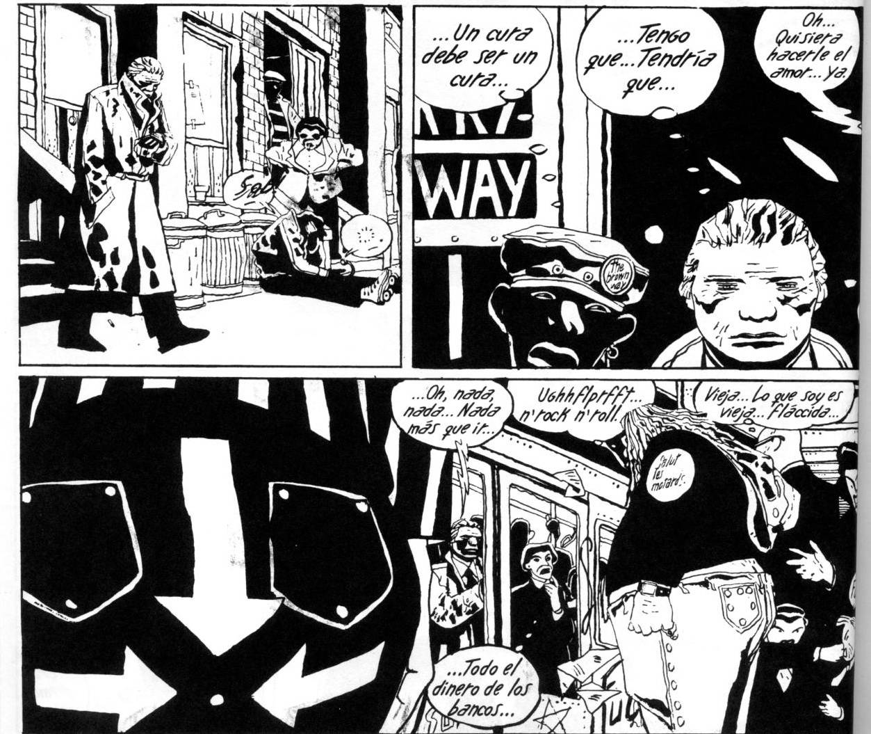 El dibujo se volvió cada vez más expresionista. Muñoz, veterano en cómics clásicos, empezó a deconstruir su línea, a crear siluetas tortuosas y oscuras, usando como marco encuadres tomados del mejor cine de los ´70—Cassavetes, Coppola— a los que llenaba de personajes extraños, dignos de un cuadro de Grosz. En ellos, Sinner podía cruzarse con su colega de Alter Linus, el mismísimo Dick Tracy, o con el Gato Barbieri —tan afín a los autores— tocando en un bar.