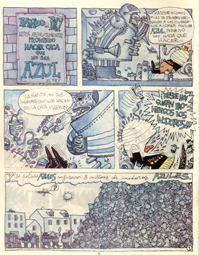 Ocho páginas, nomás, realizadas en 1978 por una dupla que tiene en su haber un montón de obras grossas, se convirtieron en la síntesis de todo lo que está bien a la hora de encarar una historia corta. Un dibujo perfecto, grotesco y elegante al mismo tiempo, una paleta de colores magnífica, y un guión tremendamente afilado, en el que Trillo nos cuenta que, haga lo que haga, el autoritarismo siempre va a perder. La rebelión va a existir siempre, por duros que sean los regímenes basados en la represión y las prohibiciones.