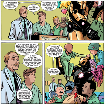 Pero debo centrarme en esta historia corta (aparecida en el nº26), una especie de insert que hace con Foggy. Este simpático amigo de Matt no la pasa tan bien durante este período: tiene cáncer. Y si bien Waid nunca mete ningún golpe bajo, a veces logra conmoverte con lo que el buen abogado tiene que sufrir. “Punching Cancer” arranca en el hospital donde está internado. Su doctor lo lleva a ver a unos pibes que adolecen de la misma enfermedad, la mayoría de ellos mucho más graves que él. Los ve reunidos en una mesa, dibujando un cómic. En él, un “desintegrosaurio” zarpado le debe su poder a un “supe cancer” que fue fundido con su ADN. Los Avengers entonces deben vencerlo con un rayo “anti cancer” que lo vuelve pequeñito, y listo. Foggy los contempla emocionado, y por un momento tiene miedo de que los pibes realmente crean que algo así es posible. Pero no, ellos saben cómo es la mano, no se desaniman y siguen en su mundo de color y maravilla. Hasta que llega el verdadero Iron Man a visitarlos y a darles un momento de esperanza, y Foggy entiende que a veces el arte es el único escape a una realidad que parece inescapable. Profundo, sencillo, directo al corazón.