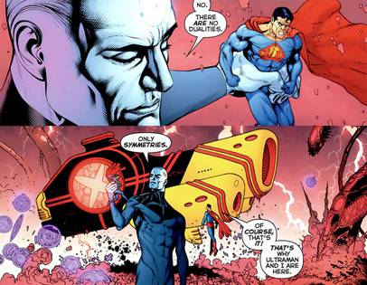 Pero bien, igualmente (y como también suele hacer el escocés) tenemos acá varios planos de texto. El más bajo, por llamarlo así, es el de la historia posta: Superman es llavado a una dimensión entre dimensiones donde debe unirse a otras versiones de él (Shazam, UltraMan, hasta el Doc Manhattan de Watchmen) para detener, entre otras cosas, la ascensión de Mammon (el dios del mal) y de Mandrakk (el monitor renegado y vampiro).