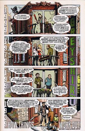 Esta breve historia aparecida en la Tomorrow Stories nº2, publicada por Wildstorm/DC en Noviembre de 1999, es una joya escrita por Alan Moore con dibujos de Rick Veitch, para el personaje Greyshirt. Es un mecanismo perfecto de relojería, en el mejor estilo Eisner donde cada una de las ocho páginas está cortada en cuatro cuadros horizontales y cada cuadro es un piso de un viejo edificio, en un tiempo diferente y las historias se entrelazan y entremezclan en historias tremendas que se mueven entre décadas y pisos. No se puede tanta magia en tan poco espacio.