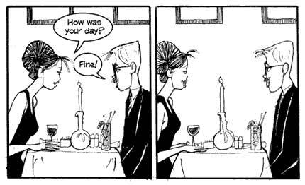 ¿Por qué Mark Kalesniko es un genio? Porque es un narrador completo, que sabe perfectamente cómo meterte en su historia, cómo enroscarte, como llevarte de la nariz y hacerte sentir lo que él quiere que sientas. Sus comics te pueden DESESPERAR (así, con mayúsculas), te pueden dejar pensando, te pueden amargar, te pueden shockear, pero NUNCA te van a parecer “un comic más”. Kalesniko es cualquier cosa menos intrascendente, y eso se debe a que el tipo PONE TODO. Hasta su propia vida, que no tiene reparos en exponer, mínimamente camuflada detrás de sus personajes.