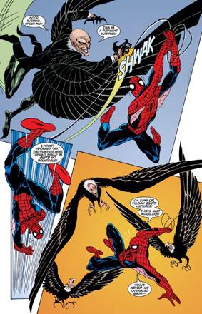 Como si todo esto no fuera ya lo suficientemente choto, los guiones están a cargo de Howard Mackie, quien en colaboración con Byrne hacen naufragar la historia de todas la maneras posibles: parrafadas infinitas, villanos que aparecen de la nada o están muy pegados a la última etapa de Mackie previa al relanzamientos y otro montón de berretadas por el estilo, nos convencen de que fuimos estafados y Spider-Man en esta época mantiene lo peor del comic de los ´90. Es un nuevo nº1 totalmente innecesario, ya que todo lo que ocurre en los primeros arcos hace constante referencia a los números de la serie anterior o a Chapter One, en un intento torpe por incorporar al canon los cambios al origen implementados por Byrne.