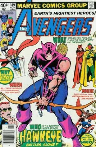 La última mini-etapa de Byrne en Avengers es la de los n°s 188-191, donde los que se reemplazan unos a otros son los guionistas. Hay un unitario de Bill Mantlo, dos números co-escritos por Roger Stern y Steven Grant, y un unitario más, de nuevo con Michelinie como guionista. Y en el medio, un annual que escribe Mantlo pero no dibuja Byrne. Lo mejor de estos numeritos está en el 189 (Nov.1979), cuando se va Thor y Scarlet Witch extiende su licencia, mientras Falcon regresa como miembro activo. Y lo más interesante es lo que pasa con Hawkeye, cuando nos cuentan qué fue de la vida del arquero desde que Gyrich lo dejó afuera del equipo.