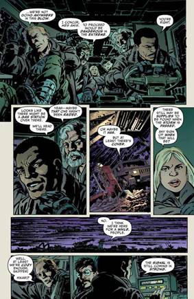 Ya en la Tierra después del impacto, el grupo se dedicara a tratar de reunirse con los posibles sobrevivientes y adaptarse a este nuevo mundo. Al tratarse de una miniserie de sólo cuatro episodios, algunas cosas no se desarrollan del todo y entre episodio y episodio transcurre una buena cantidad de tiempo, lo que le permite al barbeta contar historias puntuales, con diferentes contextos en cada una. Como dije más arriba, una suerte de Walking Dead sin los zombies y por lo tanto mucho más centrada en los conflictos humanos, pero que por desgracia se acaba muy pronto. Como la mayoría de la producción de Byrne en esta editorial, Doomsday.1 termina muy abierta y prometiendo una secuela de la que años después todavía no tenemos ni noticias, pero que realmente espero que algún día se concrete porque la disfruté muchísimo.