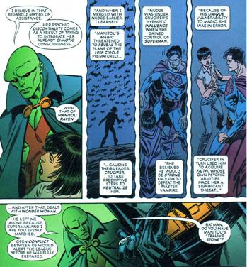 El guión firmado por la dupla, supongo tiene mucha mano de Byrne, ya que es un gran preámbulo para lo que después va a ser su Doom Patrol. No sólo es la primera aparición del equipo (y sí, otra vez Byrne reescribiendo la continuidad) si no que además, presenta varios personajes nuevos y situaciones que después van a ser fundamentales en el desarrollo de la otra serie (para mayor información, los remito a mi entrega dedicada a dicha serie unos meses atrás). Todo parece indicar que el aporte de Claremont debe venir por el lado de los diálogos, y capaz algunas ideas para lo que es plot de la Liga en si. Y ahí nos encontramos con el primer problema: la JLA contra los Vampiros se podría haber llamado la saga, al mejor estilo de las películas de Mingo y Aníbal. El villano en cuestión es un vampiro llamado Crucifer, que esta tratando de devolver a la tierra a un monton de vampiros atrapados en el séptimo circulo del infierno por las amazonas varios siglos atrás.