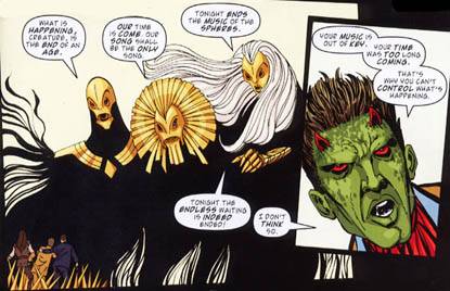 Como bien dice el título del unitario, todo gira en torno a la música de las esferas, esa teoría aristotélica que decía que las estrellas y los planetas estaban contenidos en esferas de cristal que giraban alrededor de la Tierra y cuando se tocaban producían una música que ningún ser humano podía escuchar. Así es como aparecen tres hermanos: Discord, Disharmony y Cacophony, salidos de quién sabe donde, que tienen el poder para alterar esta música y provocar la destrucción del multiverso.