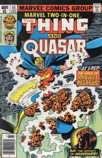 Cuando escribí la nota dedicada a The Thing, mencione al pasar que John Byrne había estado involucrado en la revista Marvel Two-in-One, dibujando algunos números en la década del ´70. Esto es lo que básicamente se conoce como “el proyecto Pegasus”, que oficialmente arranca en el nº 53 de la colección, pero que retoma elementos de un arquito de 2 partes en los nºs 42 y 43, este último dibujado por Byrne. Muy rápidamente, lo que pasa en estos numeritos es que Ben Grimm se entera que Pegasus -una agencia gubernamental dedicada a investigar todo tipo de energías- capturó a Wundarr y se mete a la fuerza a buscarlo, para terminar a las piñas con el Capitán América. Mientras tanto, infiltrado como científico del proyecto, se encuentra Victorius, quien se quiere afanar el Cosmic Cube, para después escapar a un pantano, donde es detenido de manera indirecta por Man-Thing. Por desgracia, la exposición al cuba deja a Wundarr en coma, lo que hace que el guapo Ben acepte un puesto en la seguridad del complejo para estar cerca de su sobrino postizo.