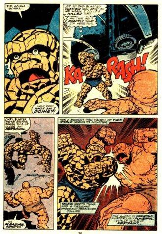 Igual la papa fina, donde Byrne realmente pone la pija en esta serie, es en el número 50, escrito y dibujado por el maestro. Esta historia, que si bien va entre medio de lo de arriba decidí mencionar aparte porque no tiene un choto que ver con lo otro, enfrenta a Ben Grimm consigo mismo, en una aventura brillantemente contada y dibujada como los dioses. Para no hacerla muy larga y que la vayan a leer (porque al fin y al cabo es un numerito suelto), lo que sucede es que Reed Richards descubre una cura para la condición de Ben Grimm, pero se da cuenta que su “mutación” ya está muy avanzada y no le sirve de nada, que hubiera funcionado si la hubiera descubierto durante sus primero años. Entonces, Ben decide viajar en el tiempo, hasta unos meses después del accidente que lo transformó y darse a si mismo el antídoto, pero las cosas no suceden como él lo espera. Como dije, este numerito vale muchísimo la pena y lo recomiendo por encima de la saga de Pegasus que, si bien es entretenida y está repleta de personajes de la B que pululaban por el Marvel setentoso, no está al nivel del unitario que enfrenta a las dos Cosas.