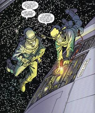 En estos dos capítulos finales, Byrne se pone las pilas y pela no sólo muy buenas ideas, sino que retoma un plot de otra de sus miniseries, Asigment Earth, en particular un capítulo con unos clones del ejército creados como máquinas de matar, que era transportado a un planeta distante. Acá el Enterprise llega a ese planeta y descubre a esta raza de humanos inmortales que llevan 300 años peleando entre ellos, un disfrute total. En el último capítulo caen en una suerte de limbo y Byrne aprovecha para hacer páginas y páginas con fondos blancos e incluso una completamente negra con un pequeño Enterprise en un rincón. Sabemos que el viejo está choreando, pero queda tan lindo que no nos importa un carajo.