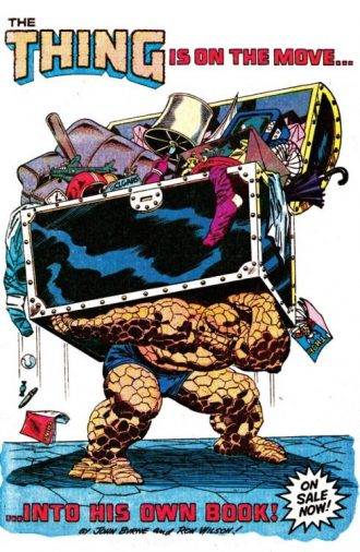 Al mes siguiente (Julio de 1983) saldría un nuevo número 1, también escrito por Byrne y con dibujos de Ron Wilson, pero ahora de un título en solitario de la Cosa. Según parece, todas las historias que podía dar Ben acompañado ya sucedían en los FF, por lo cual uno de los pedidos del gran John para hacerse cargo de la serie fue que se acabaran los team-ups. La serie es interesante, y explora en profundidad la idea de que Ben Grimm se considera a si mismo un monstruo y le cuesta llevar una vida normal. Para colmo, los hechos recientes del título de FF dejaron a su novia Alicia Masters hospitalizada y él no puede evitar sentirse responsable.