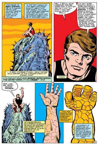 Y acá es donde Byrne aprovecha de manera maravillosa el estar a cargo de ambos títulos, y los entrelaza en formas muy sutiles, que no dejan dudas de que todo lo que le sucede a los Cuatro Fantásticos tiene impacto en la vida de Ben. Aún así, eso no va en detrimento de poder disfrutar la serie, que se entiende por si sola, sin tener que leer el otro título en paralelo. Igual el tema de que ambos títulos estuvieran tan relacionados es algo que molestaba al maestro y por eso venia tejiendo una idea fabulosa, que se concretaría después del nº 10 y gracias a la llegada de las Secret Wars (sí, parece que ese evento de mierda sirvió para algo).