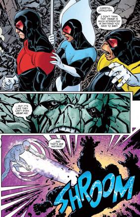 Por lo tanto, y desdiciéndome de manera asquerosa de todo o que puse en la nota anterior, Triple Helix, gana cómo está narrada, más que por lo que narra, que en el fondo no deja de ser una más de superhéroes del montón con un terrible toque retro. Pero ahí, en la forma de ir amalgamando las distintas miniseries, en ese intento de armar un mosaico que nos presenta un universo nuevo (si bien muy parecido a otro) es donde está parte de su magia, y lo que nos deja con ganas de que algún día retome el proyecto y nos cuente desde el punto de vista del Conclave (los que serian sus Avengers, con un ligero cameo en esta mini) cómo se sigue conformando este universo donde el barbeta se podría despachar a sus anchas sin que nadie lo reprima, ni le ponga freno.