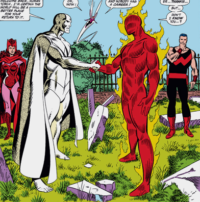 La saga de Vision Quest comprende desde el n°42 hasta el 50 y es una de las mejores cosas que condujo Byrne en su historia. El secuestro de la Visión – a raíz de cuando Vision quiso controlar el mundo en Avengers n°251 – lo devuelve funcional a los Vengadores pero demasiado cambiado. Byrne le arranca el alma a Vision y hace un paso super lógico que nadie realizó por falta de compromiso o agallas. Este hecho dispara la tensión de vínculo, desarrollo de personajes y triangulo amoroso de Vision/Scarlet Witch/Wonder Man. Culebrón fino, paquero y a puro sci-fi. De la mano de esta saga viene el regreso del único e incomparable Human Torch Original, John Hammond! Pilar fundacional de Marvel quien debutó en Marvel Comics n°1 de 1939! ¡Gracias Byrne! (El Tío John siempre te mete a los Invaders en sus títulos de Marvel 🙂