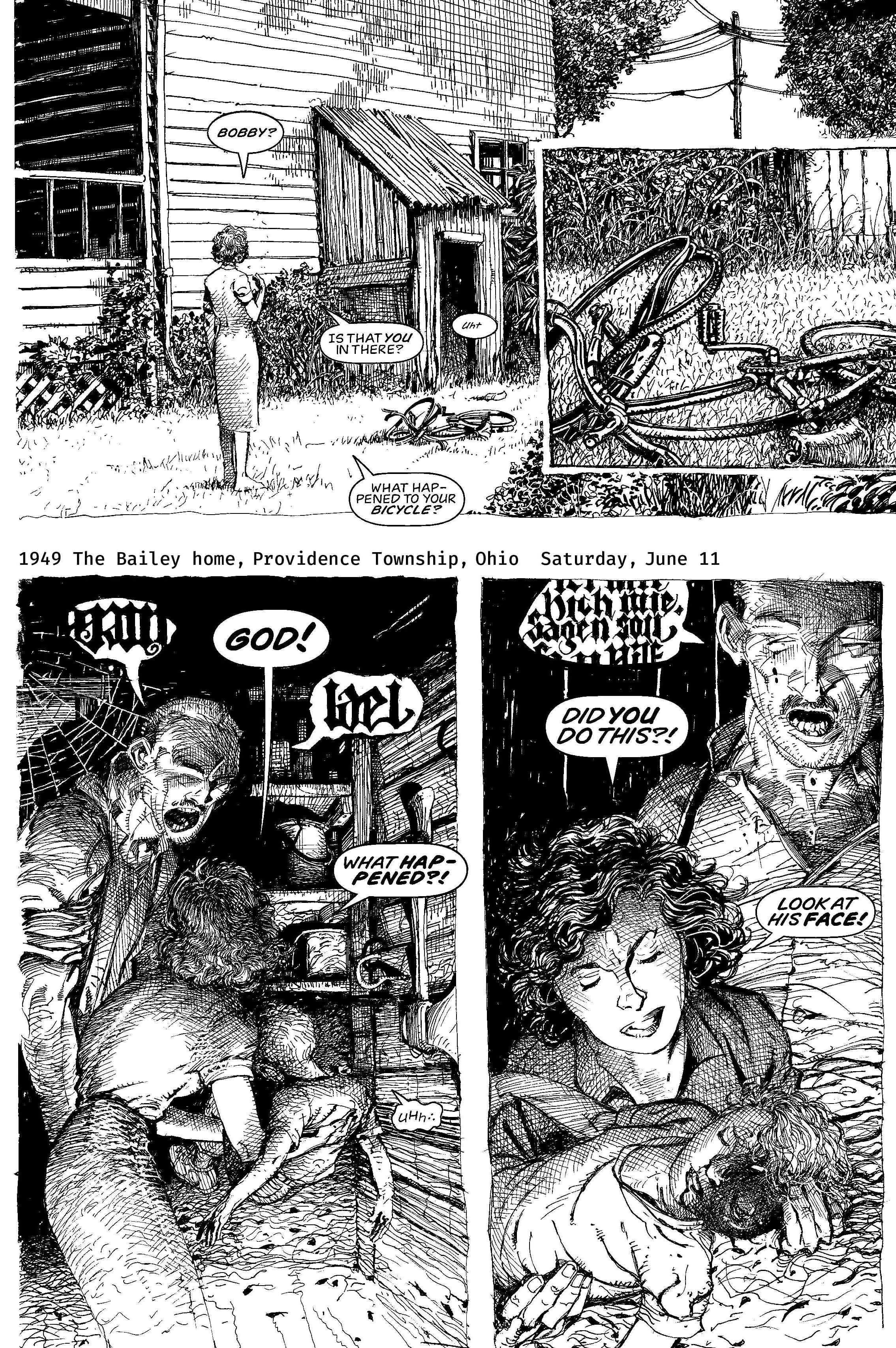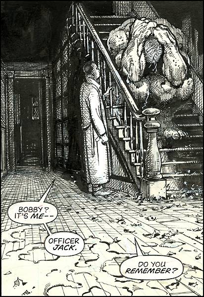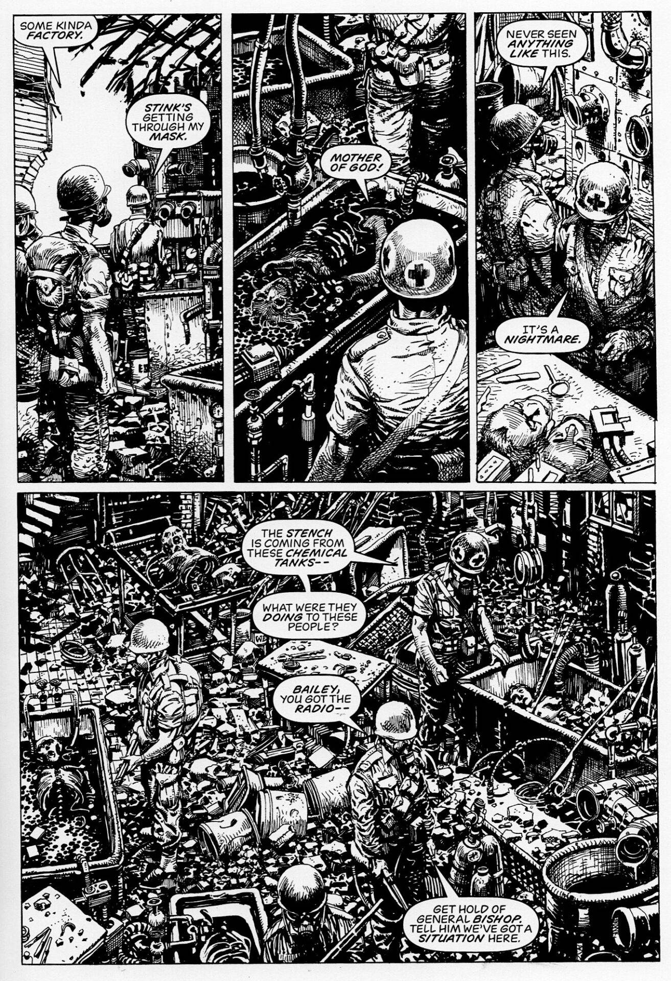 La obra no boludea ni pierde el tiempo: inmediatamente vemos la continuación de los “avances” científicos nazi, que fueron trasladados a la Norteamérica de la libertad. Todo el tono está invadido por una crueldad sin rodeos, donde Windsor-Smith ejecuta (durante las trescientas y pico de páginas en blanco y negro) cada sombra como si fuera la conciencia de los sujetos que la protagonizan. BWS eligió contar esto desde la arquitectura de lo cotidiano, con familias rotas o violencia intra-vincular, mucho antes de llegar al body horror. Es más que obvio que los monstruos del título no son lo que muestra la portada. Y el texto sabe eso desde la primera página.