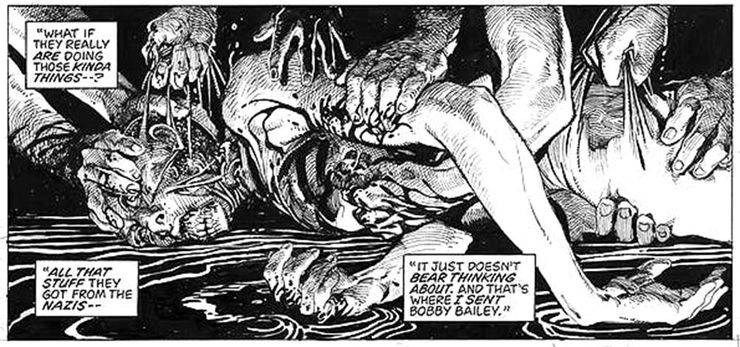 Un pobre tipo como Bailey, convertido en monstruo… ¿impacta más que una bomba nuclear reventada en el Pacífico como parte de una prueba científica? ¿o que 5.000 personas usadas como cobayos de agentes químicos en el Arsenal Edgewood? (MW de Tezuka, te estoy mirando).