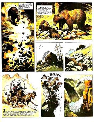 En el caso de El Pequeño Salvaje el guion es pobre. No llega a ser una falta de respeto, pero está muy por debajo no solo del nivel del dibujo (lo cual sería lógico) sino también del nivel de los guiones de otros trabajos «por encargo» realizados por Ortiz en los ´70 y ´80. La breve novela gráfica empieza como un remedo de Tarzan, pero con osos en vez de gorilas y el Oeste de los EEUU (la ambientación favorita de Ortiz) en lugar de la jungla africana. Y avanza a fuerza de casualidades absolutamente improbables, que ponen al verosímil de esta historia por debajo del de cualquier cuento de hadas.