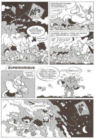 Primero, hay que pensar que esta serie 100% en joda coincide con los años en los que las aventuras de Super López se vuelven menos cómicas, porque Jan y EfePé empiezan un viraje hacia una cierta sátira social, sin descuidar la aventura, pero con menos énfasis en los chistes. No es un delirio pensar que en las planchas de Superioribus, Jan encontró el refugio ideal para el humor que había quedado un poco relegado en esta etapa más «madura» de su personaje más popular.