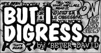 El Gordo David (con todo respeto) tenía una columna en el periódico semanal Comic Buyer’s Guide llamada «But I Digress» (Pero desvarío). El libro que reseño en esta oportunidad, es una recopilación de esas mismas columnas que se iniciaron en 1990. En esta antología son muy destacables sus referencias a la creación de Image Comics y su evidente enemistad con Todd McFarlane. Es divertidísimo leer cómo David se planta, educa y sopapea a las “estrellas” de Image en su momento más trascendente. También tira dardos contra John Byrne, y el libro –a veces- se convierte en una tormenta Luis Venturesca netamente comiquera y entretenida, para la gente del palo que lee comics Made in U.S.A.