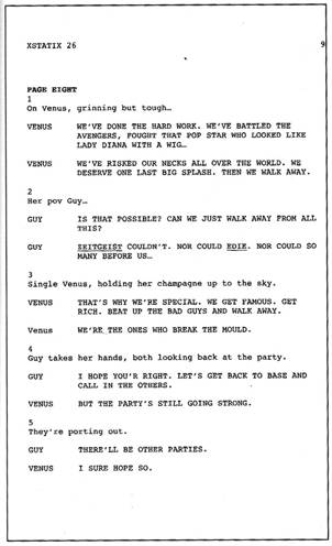 El actual autor de Wonder Woman tiende a tardar dos semanas en escribir un guión. Sin embargo, Brubaker escribe la sinopsis el lunes o martes, y el guión completo de miércoles a viernes. Geoff Johns tiene el mismo sistema. Brian Vaughan se toma una semana para escribir un guión completo. Mike Carey también tarda una semana en escribir un guión completo y lo empieza a mano con bosquejos y diálogos, para finalizarlo de jueves a viernes. Greg Rucka puede tardar de uno a diez días. Bruce Jones escribe 5 páginas por día, etc.