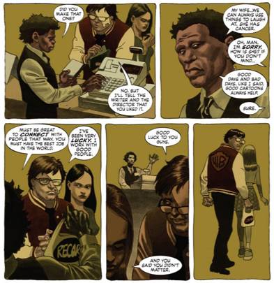 Lo genial es que se edita en el sello Vertigo (¿cuánto hace que no sale algo del personaje en ese sello?), en una hermosa edición hardcover con sobrecubierta. Y en él, este suceso traumático se cuenta con lujo de detalles. O sea: no es una historia de Batman, si no una historia acerca de cómo Batman puede o no influír en la vida de alguien (y que justamente es quien suele darle vida en obras artísticas). Recorriendo sus páginas, veremos a un Paul niño, aislado y solitario de sus pares en la escuela, que se aferra al mundo de la imaginación desde sus primeros pasos como algo incluso más real de lo que le toca vivir día a día. Sus años en Warner, sus relaciones frustradas, su éxito en lo que hace. Aparecen Bruce Timm, Eric Radomsky, Arleen Sorkin… hay una historia de Sandman, ideas descartadas de Batman Beyond, animación vintage…y la noche trágica.