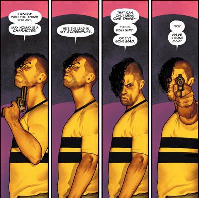 Depresión, tristeza… decepción. ¿Por qué a él? Las líneas blancas dan lugar al pensamiento final: el caño a su sien, apretando bien las muelas. Y en el postrer momento, antes del vacío, una voz se oye: Max Nomax, personaje de su ficción, se le aparece y le dice que el tumor no es tumor, sino un balazo cósmico que le entró al cerebro, lleno de data. Una especie de pendrive mega-existencial lleno de información, de la información que involucra justamente a Nomax y a cómo mierda escapó de su prisión en las estrellas, cómo llegó allí, y cuál es su propósito.