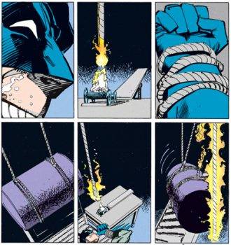 Tal vez lo más comentado del bati-run ya reseñado por Fede Velasco dentro de esta columna sea el mecanismo narrativo que Morrison inventó para que las historias fumonas de la Silver Age sean canónicas. Pero si bien no hay una intención similar en Gothic, si hay elementos que, para 1990, suenan muy anticuados, como Batman atrapado en una máquina que funciona en complejísimos pasos, fiel a la tradición de W. Heath Robinson (o de Rube Goldberg). Una boludez de la que obviamente Batman se va a salvar a último momento porque es Batman y todo lo puede. Hay una sensación de extrañeza al leer Gothic, porque, si bien la intención de mezclar el mundo del hampa con el esoterismo está, no es del todo coherente y cohesiva, de hecho casi ni se tocan. Bah, se tocan pero de manera tangencial, y ya a mitad de la miniserie, la parte criminalística se abandona por completo. Aunque de recuerdo nos deja una gran escena donde los mafiosos arman una bati-señal invertida para llamar a su peor enemigo cuando las bajas de éstos empiezan a amontonarse. Craso error.