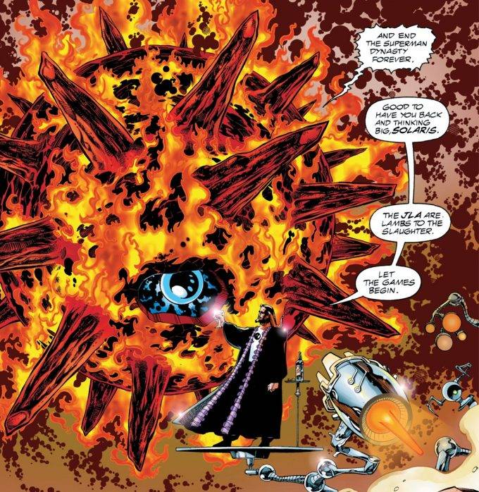 Básicamente, DC One Million trata sobre el encuentro entre la JLA y la Justice Legion A, que es una Liga del Siglo 853 en la que militan versiones futuristas de los grandes héroes del presente. Esta Legion no protege solo a la Tierra sino a todo el sistema solar y tiene entre sus miembros al Hourman que ya habíamos visto en la JLA, y a John Fox, el Flash del futuro que Morrison había creado durante su paso por la revista de Wally West. Originalmente se nos había presentado a John como el Flash del Siglo XVII, pero acá el personaje cuenta que fue desplazado en el tiempo hasta el año 85265, y hace cinco años que se unió a la Justice Legion A. El villano principal es Solaris, una estrella maligna, hiper-poderosa, oriunda del futuro, pero en el primer tramo de la saga también hay un rol destacado para el inmortal Vandal Savage, que se da el lujo de volar a la mierda la querida ciudad de Montevideo. Se ve que no le gustaban ni el mate, ni el chivito canadiense, ni ir a ver un show de Jaime Roos o un Peñarol-Nacional al estadio Centenario. La gracia es que la JLA del presente combate a Solaris en el futuro y la Justice Legion, junto a algunos héroes «secundarios» de la JLA (Steel, Plastic Man, Huntress, Zauriel…) combaten a Vandal Savage en el presente, con la ayuda de los Titans.